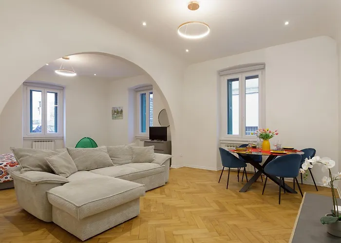 Plac Piazza dell Unita d Italia znajduje się w około 20 min pieszo od apartamentu o powierzchni 80 m^2, podczas gdy Kanał Grande di Trieste znajduje się w 25 min pieszo. Z tego apartamentu można w 20 min dojść do centrum miasta. Nie więcej niż 5 min pieszo od obiektu leży Giardino Storico di Piazza Carlo Alberto.